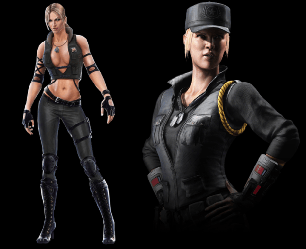 The above image shows Sonya Blade’s costumes in Mortal Kombat (2011, left) and Mortal Kombat X (2015, right). In-game dialogue from Mortal Kombat (2011) pokes fun at her costume’s sexual nature, while the right image reflects an attire that is more associated with that of a military officer, which is a core element of Sonya’s character.