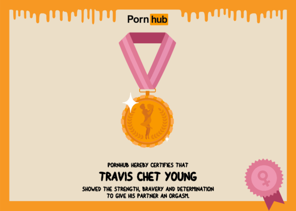 PornHub offers a kitschy answer for that one. Certify an Orgasm Giver lets you reward someone who has given you an orgasm. It’s cheesy as fuck, but it’s one way to loudly talk about the Orgasm Gap. And you could, oh, I don’t know, do what I did and post it on your partner’s Facebook wall.