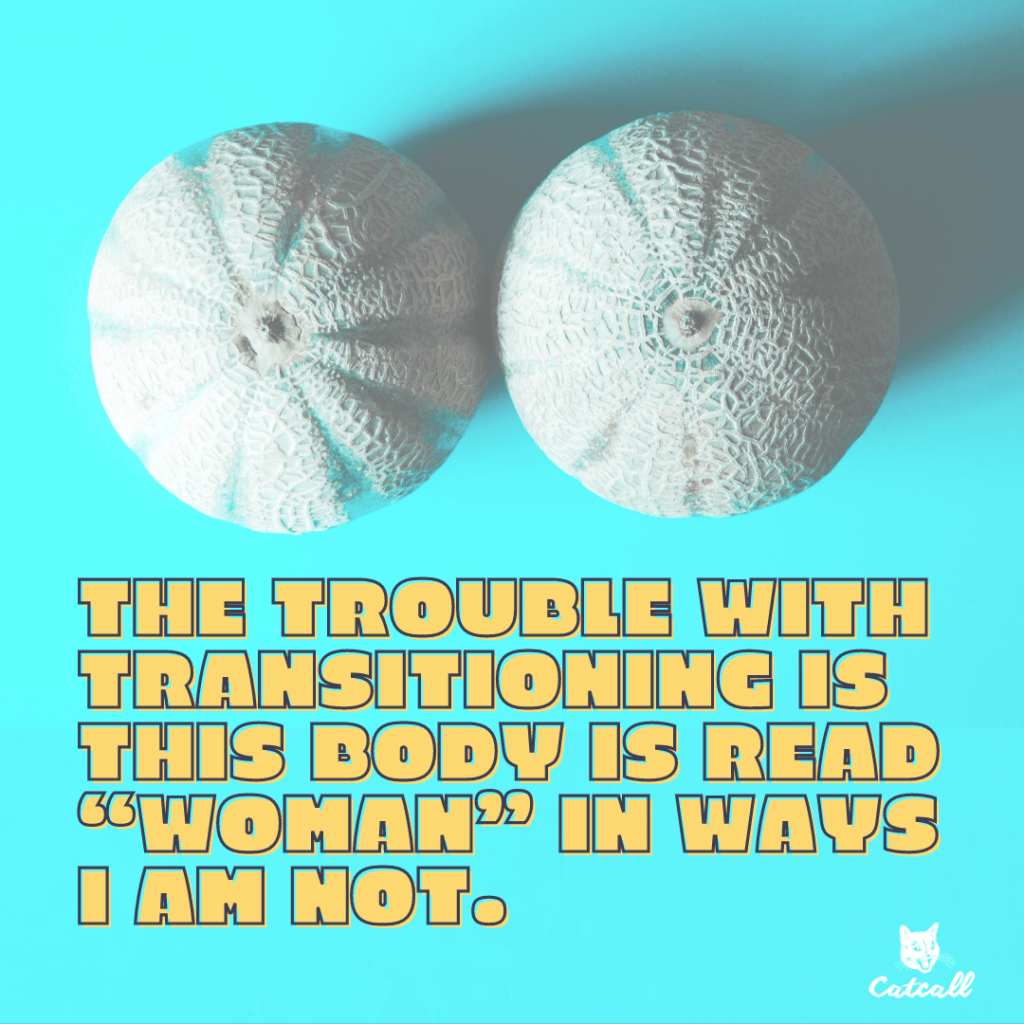 There is nothing wrong with me, but I have to pretend there is to create a body that scrambles catcalls and confuses night stalkers. There is nothing wrong with me, but I will pretend there is to get what I need. The trouble with transitioning is, everyone’s free to make decisions about my body except me. So I made the appointments to masculinize my feminine body and when it is all said and done, I will still have the audacity to call myself a womxn.