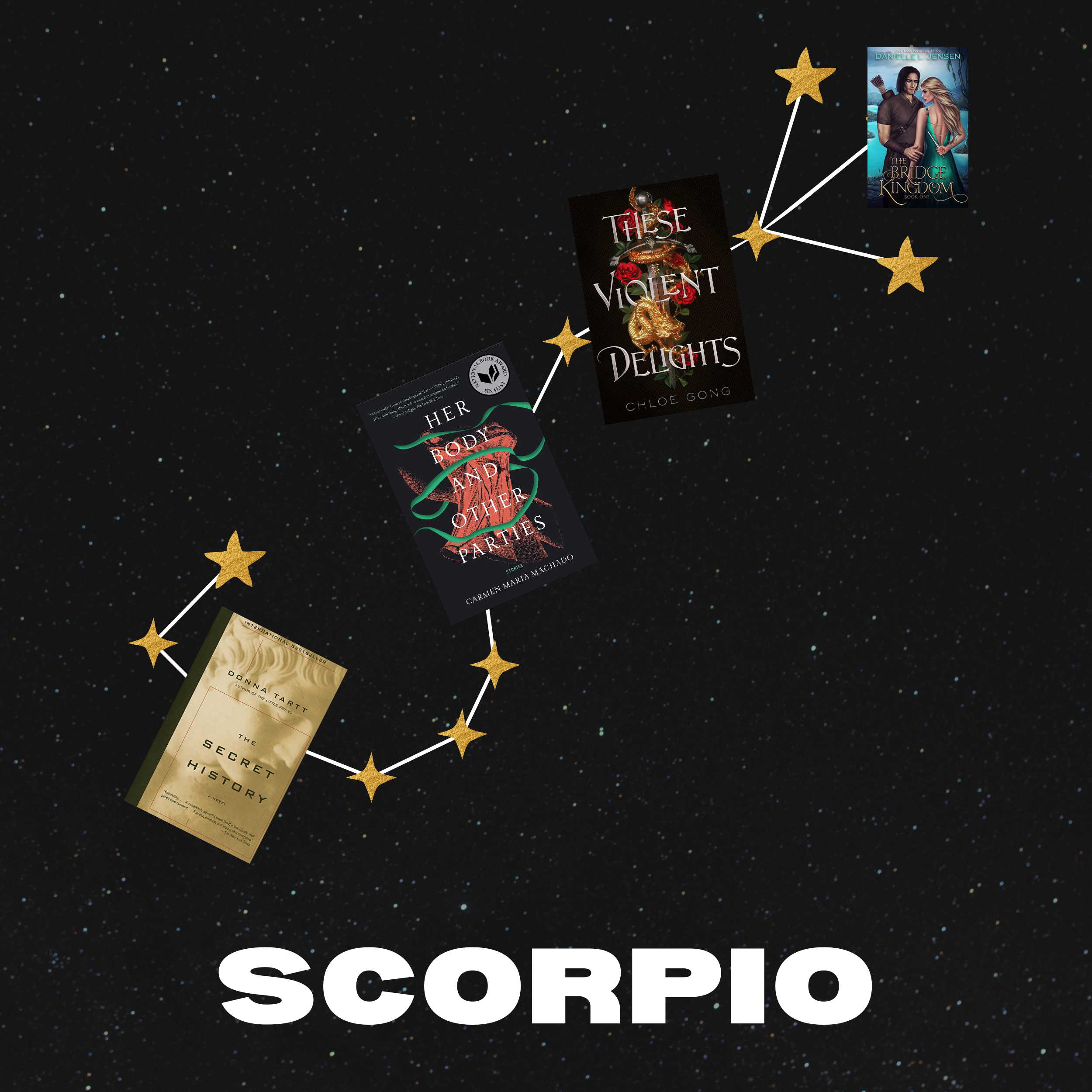 Scorpio is the most intense sign in the zodiac—and for good reason. They often represent death and rebirth, as well as sexual energy. The planets of Mars and Pluto rule Scorpios, giving the sign a fiery, passionate animalistic energy. Despite what it may sound like, Scorpios actually are water signs—giving them a feminine touch to all that masculine energy from its ruling planets. Books written for Scorpios include the well-known classic The Secret History by Donna Tartt this book follows a group of university students as they discover a new way of thinking and living, leading them to corruption, betrayal, and evil. Of course, it wouldn’t be a book list for scorpios without mentioning something a little sexy, and A Bridge Kingdom by Danielle L. Jensen has it all: forced marriage tropes, spies, yearning, and light sexiness.