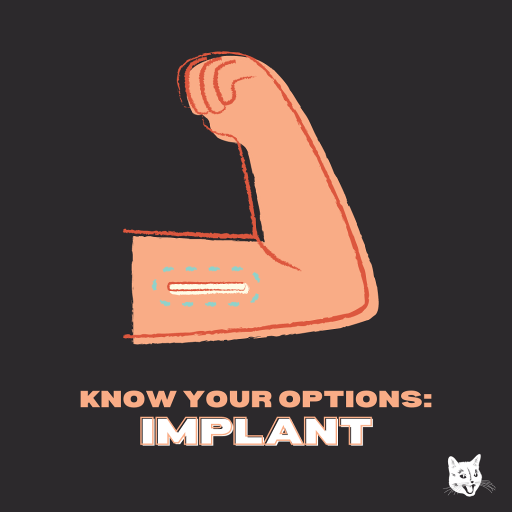 The implant is a small rod that is safely implanted (ha) into your arm. It releases a hormone called progestin to help prevent pregnancy. The good news about the implant is that once it is in place, it can stay there for up to five years. No daily reminders needed.