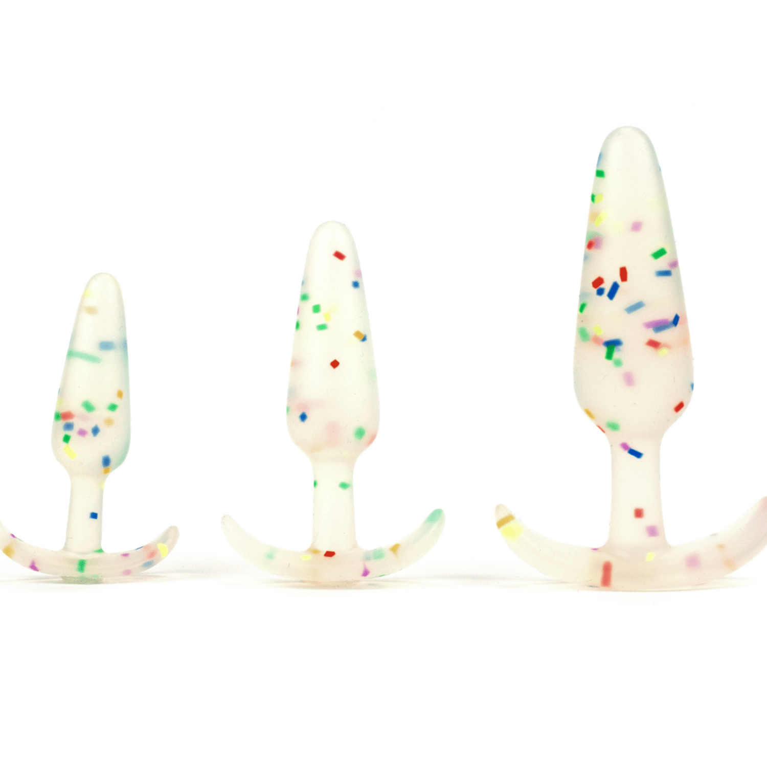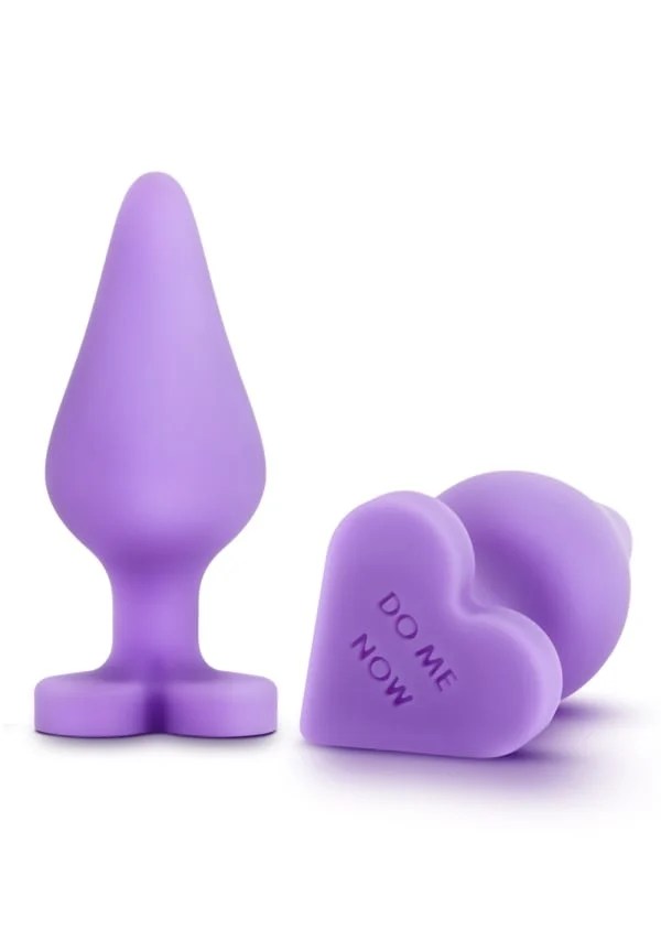 “We love these curvy, tapered-tip plugs with their heart shaped bases and cute little messages. Each color has a customized love note: Be Mine, Do Me Now, or Spank Me. These mid-sized plugs may be a little bit girthy for novices. Use plenty of water-based lubricant for ease and comfort of insertion.”