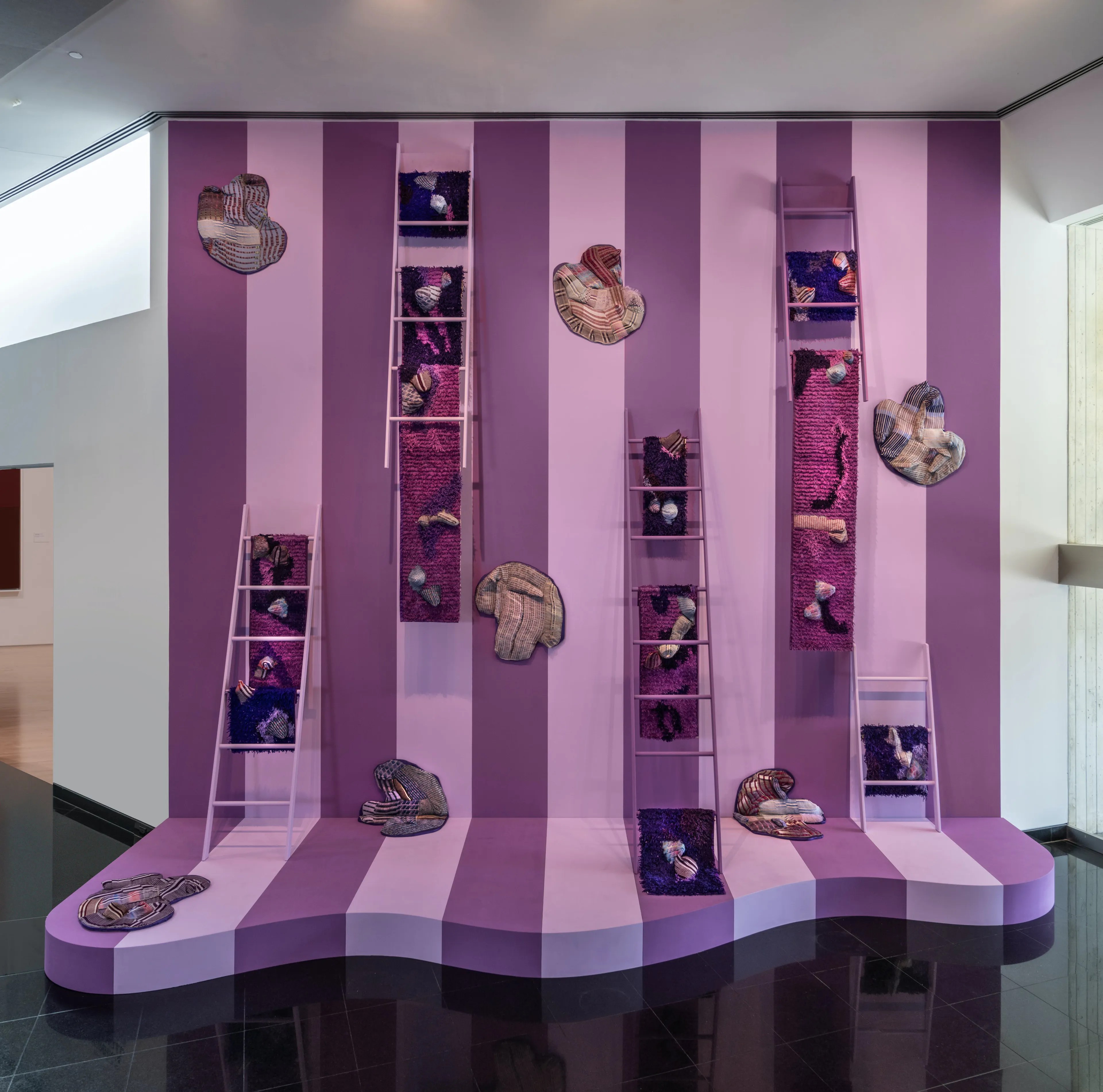 Zapata’s textile pieces are draped, suspended, and slumped along the atrium wall, suggesting the many flags, banners, and quilts collaboratively constructed to encourage better futures for her community through solidarity and mutual care.